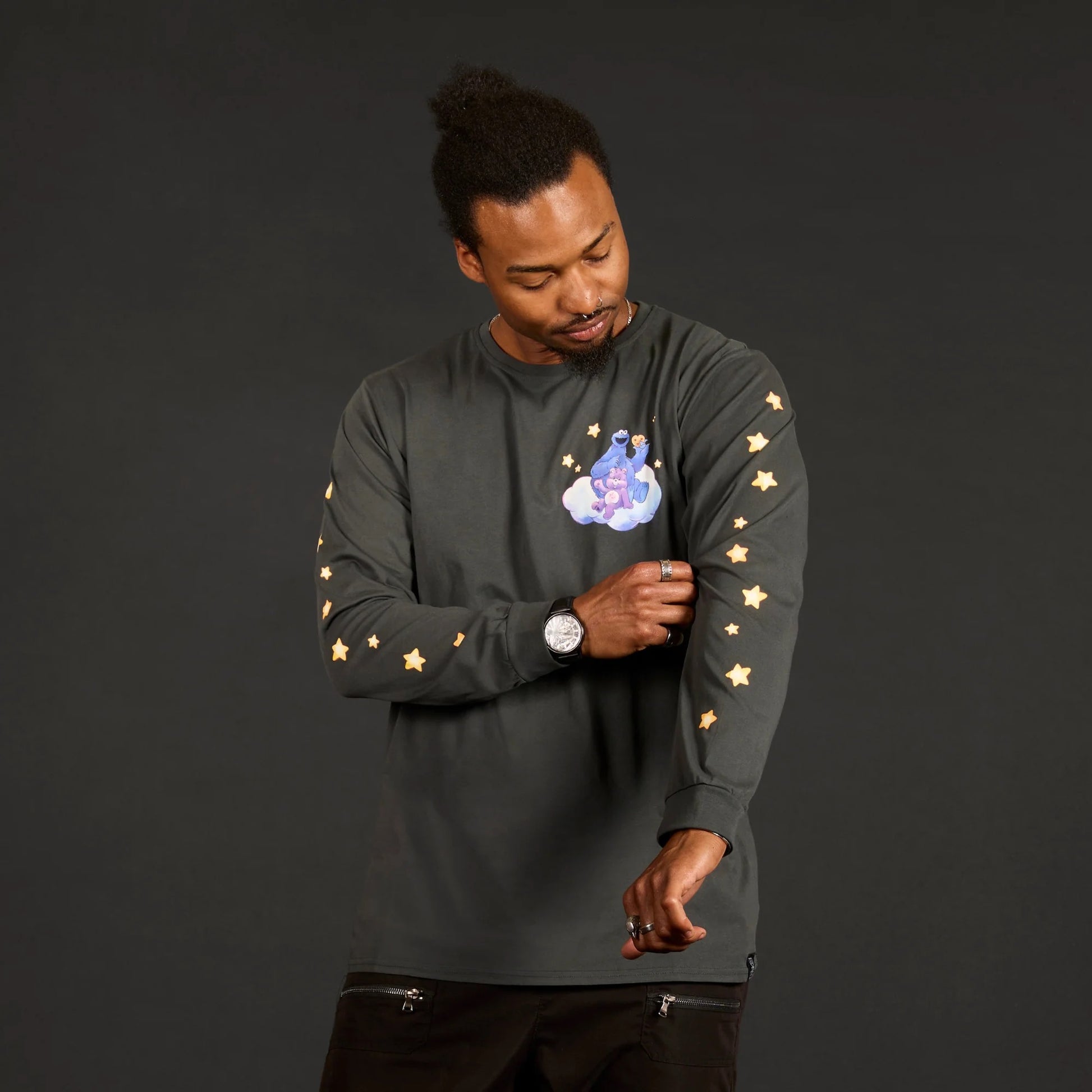 Celebrate the magic of friendship with this Care Bears™ x Sesame Street Long Sleeve T-Shirt! Featuring a whimsical front and back graphic of Cookie Monster and Share Bear™ sitting on a cookie moon among the clouds, this unisex tee brings together two beloved worlds in a cozy, stylish way. Every purchase supports Saturday Morning Cartoons United, a 501(c)(3) non-profit providing relief efforts for animators in need.